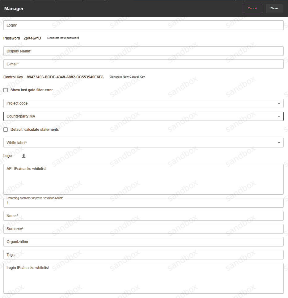 AgentGlobal platform contains integrated calculation system to reflect the tariffication between business process partners. Calculation happens on each level, from dealer to merchant. Bank fees are calculated for tariffication and settlement, but statements for settlement with the bank are not provided by the system. Instead, the system calculates statements per Merchant and indicates which exact amount should be received from the bank. Statement is individually generated for each manager or each merchant of this manager. Statement date is called business day. Statement for business day contains all projects for chosen manager. Statements will be calculated for manager if such option is enabled. If statement should be calculated, enable the Default calculate statements flag in manager account details. If this option is not enabled, statements setting in projects of exact manager will be unavailable and statements are not calculated.