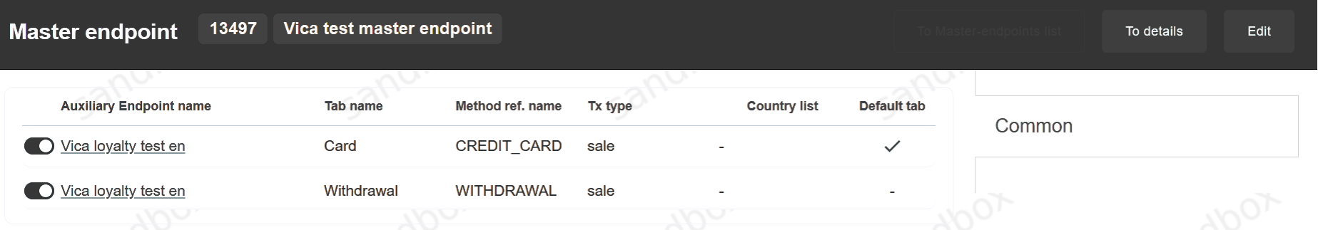 Click on the To details button to view Master Endpoint itself (filters, payment form, name and etc).